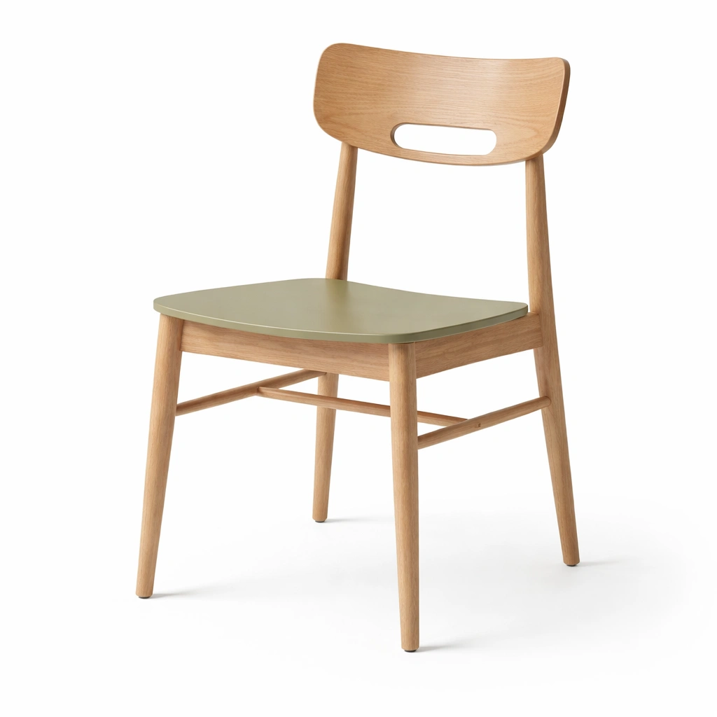 Dieser Stuhl besteht aus massivem Eichenholz und einem Sitz aus MDF in Grün. Der Stuhl hat eine Höhe von 80 cm, eine Breite von 45 cm und eine Tiefe von 50 cm. Die Tragfähigkeit beträgt 120 kg.