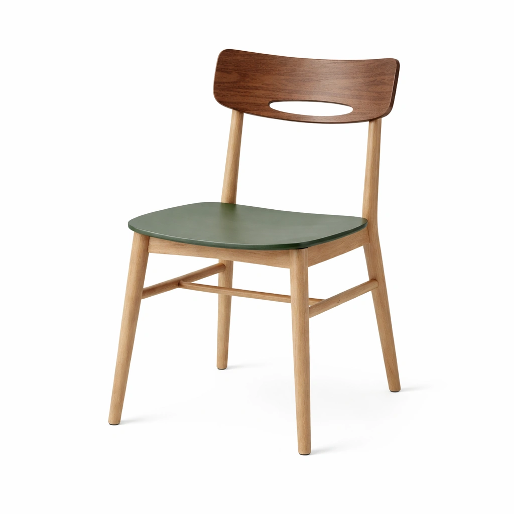 Esszimmerstuhl mit einer Sitzfläche aus lackiertem Holz in Dunkelgrün, Rückenlehne aus Walnussholz und Beinen aus Eiche. Tragfähigkeit bis zu 120 kg.
